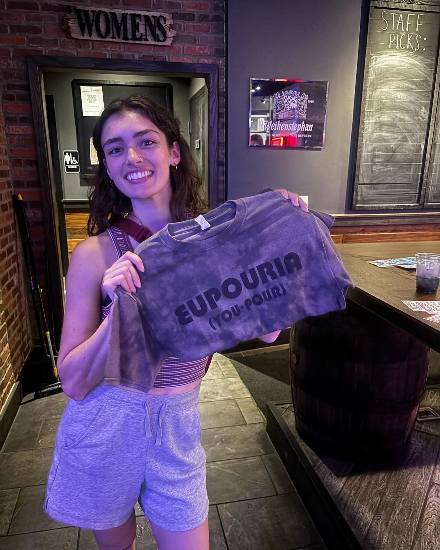 A young woman with shoulder-length brown hair and hoop earrings is smiling and holding a purple tie-dye shirt with the word 'EUROURIA' and '(YOU-POUR)' printed on it. She is inside a bar or restaurant, standing near a table with a drink and some pape